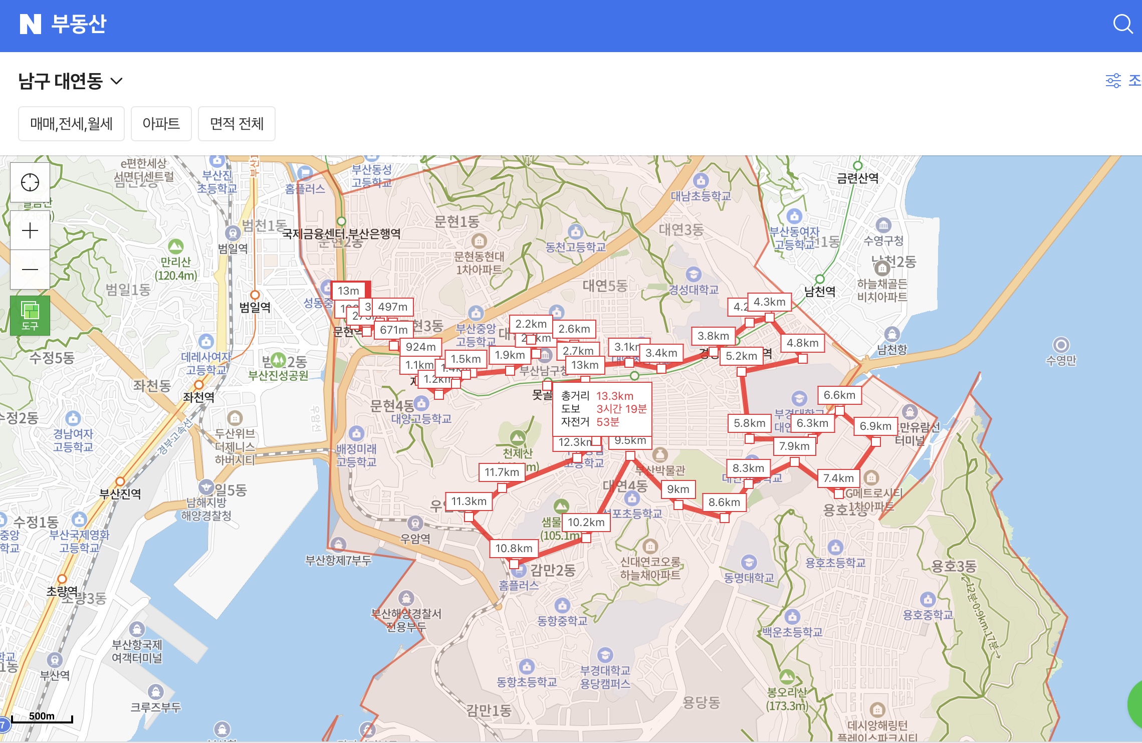 네이버 부동산 - 도구 - 거리재기를 실행해서 루트를 짜요!