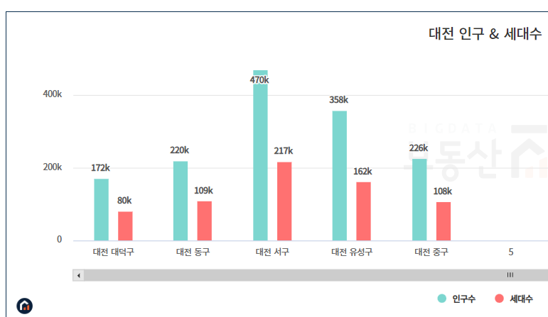 ▶ 행정구별 인구수 : 서구> 유성구> 중구> 동구> 대덕구