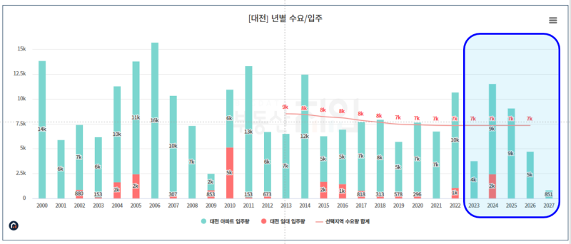 ▶ 대전광역시 입주량은 2024년, 2025년 과잉공급이며 인구유출이 많은 세종특별시를 함께 보아도 과잉공급이다.