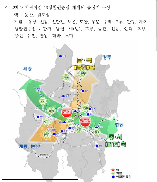 ▶ 대전 공간 구조 개발 전략과 생활권 배분을 합쳐 정리하면 다음과 같다.
