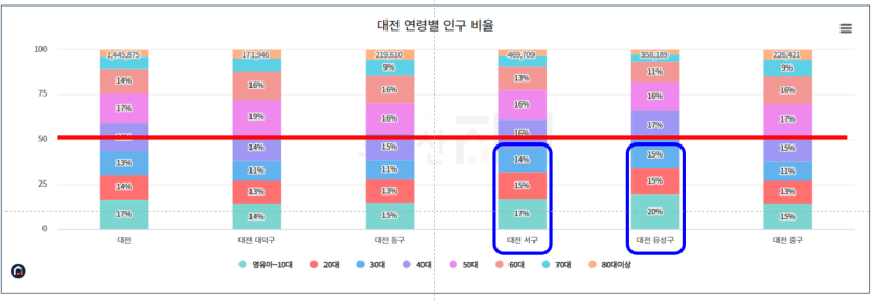 영유아~10대 비율은 상대동> 관평동, 용산동> 반석동 순으로 높았다.