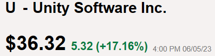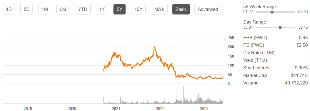 유니티 5년 차트 메타버스 열풍, 저금리 시대로 한때 주목 받아 $210이 전고점이다.