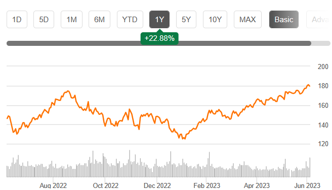AAPL, 1년 차트 전고점 $181.36을 가뿐히 터치하고 역사적 신고가 $184.95까지 올랐지만 차익실현 매물로 하락마감.