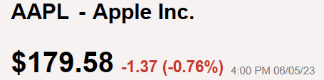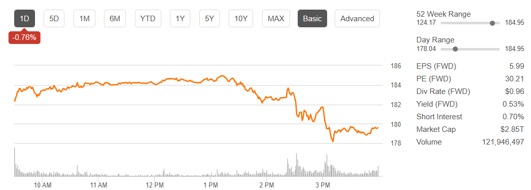 애플 주가는 장중 한때 184.95달러까지 치솟으며 사상 최고치를 기록했다. 그러나 장 후반에는 약세로 돌아서면서 0.76% 내린 179.58달러로 마감했다.