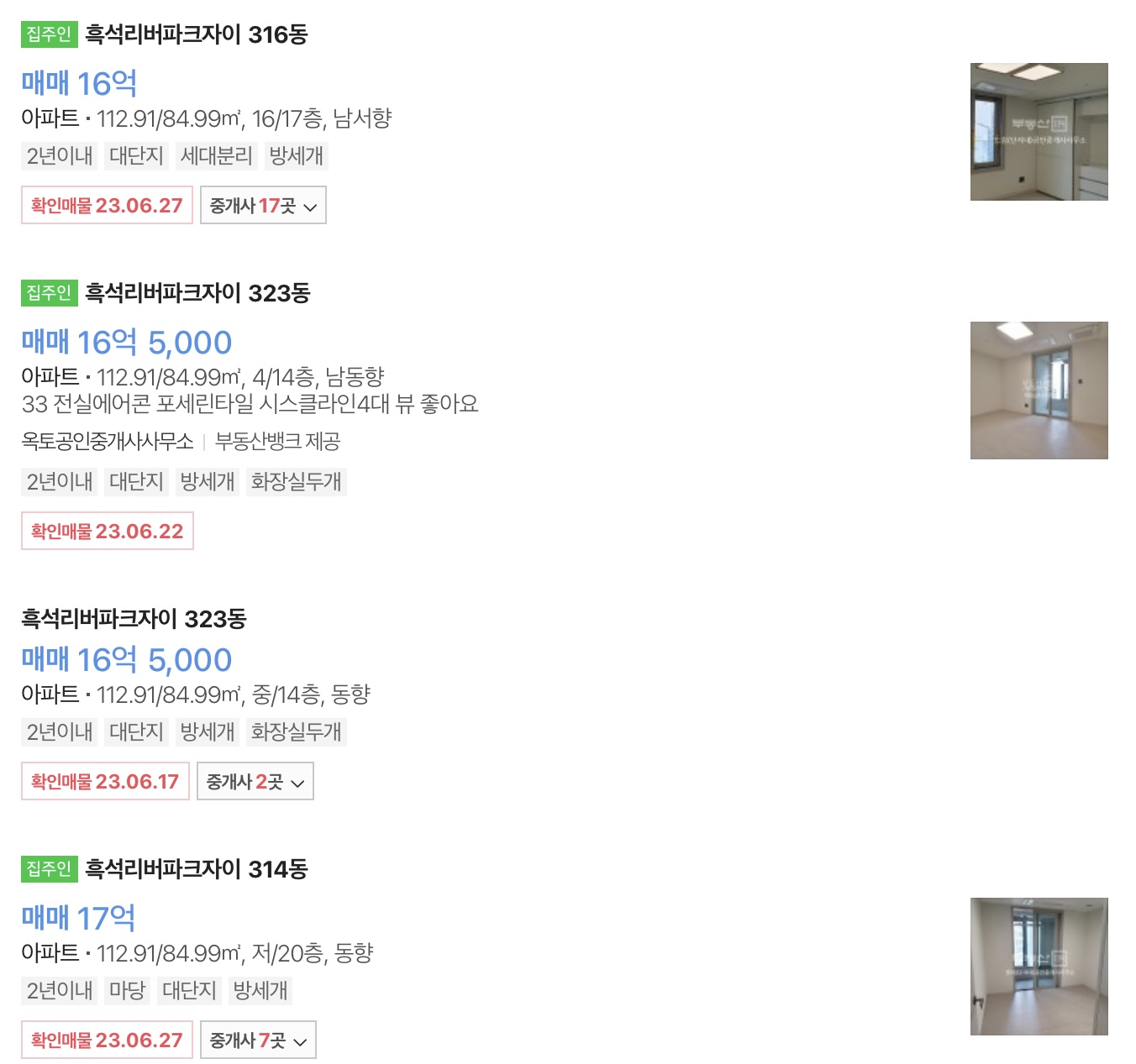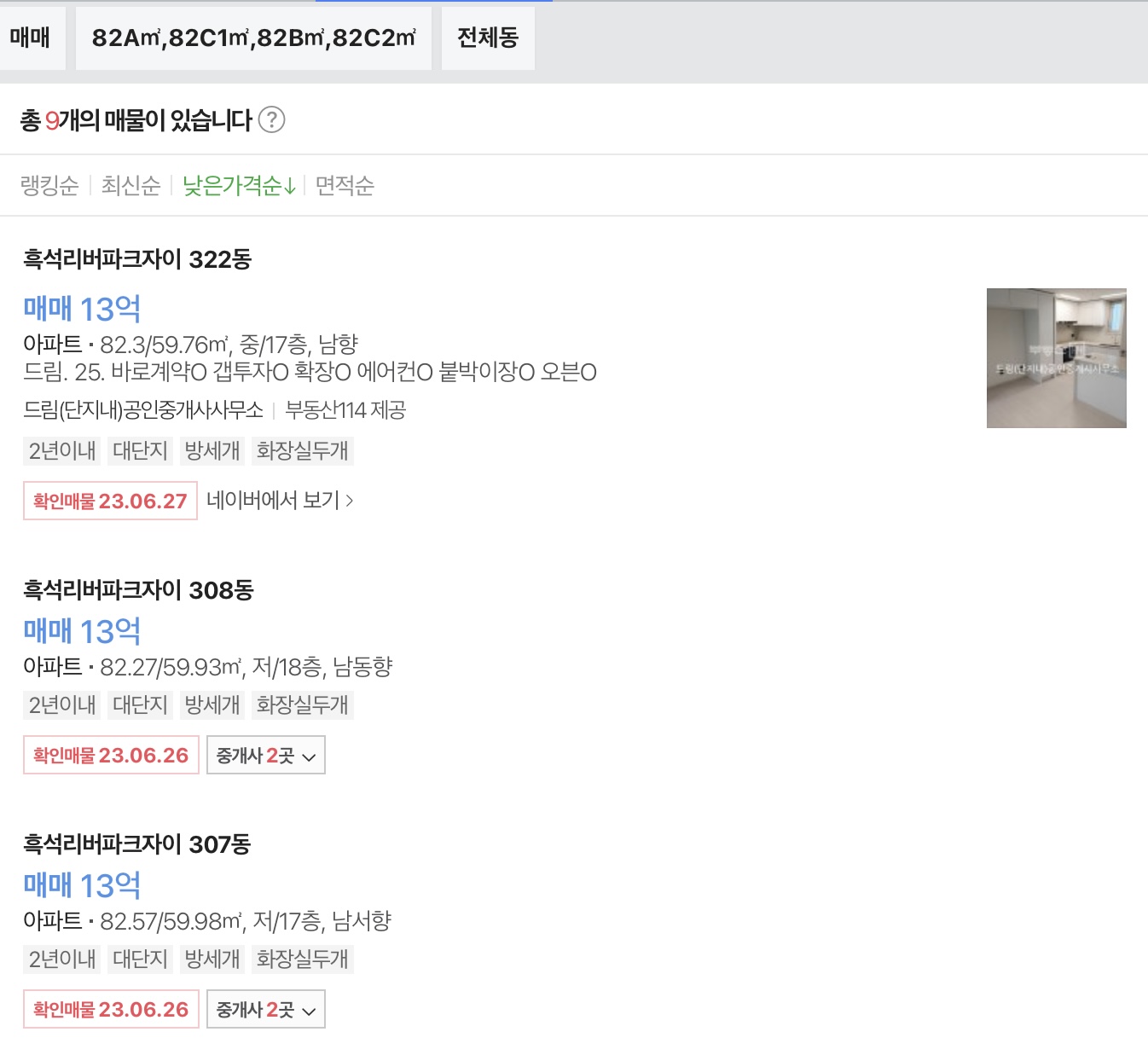 현재, 59타입 13억, 84타입 16억원으로 매물이 나와있습니다.