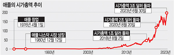세계에서 가장 몸값이 비싼 기업인 미국 애플이 ‘꿈의 시총’으로 불리는 시가총액 3조달러를 세계 최초로 돌파했다. 1976년 미 캘리포니아주의 한 차고에서 스티브 잡스와 스티브 워즈니악 등이 애플을 공동 창업한지 47년만이다. 시장에서 라이벌로 꼽히는 구글 몸값(1조5300억달러)의 2배, 한국 최대 기업인 삼성전자(3637억달러)의 8배 이상이다.