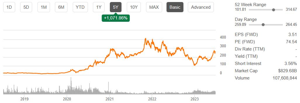 테슬라 5년 차트 현재 프리장에서 +6% 상승중