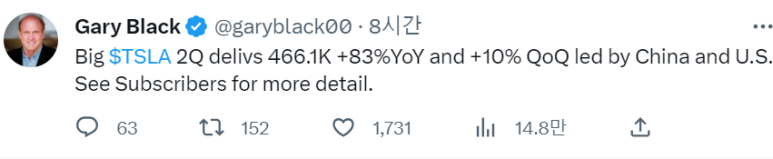 테슬라 이번 2분기 차량 인도량이 전년 대비 80% 넘게 급등하며 시장 전망치를 뛰어넘었다. 분기마다 인도 대수가 40만대 중반에 안착하면서 안정적인 인도 대수를 확보하게 됐다는 평가가 나왔다.