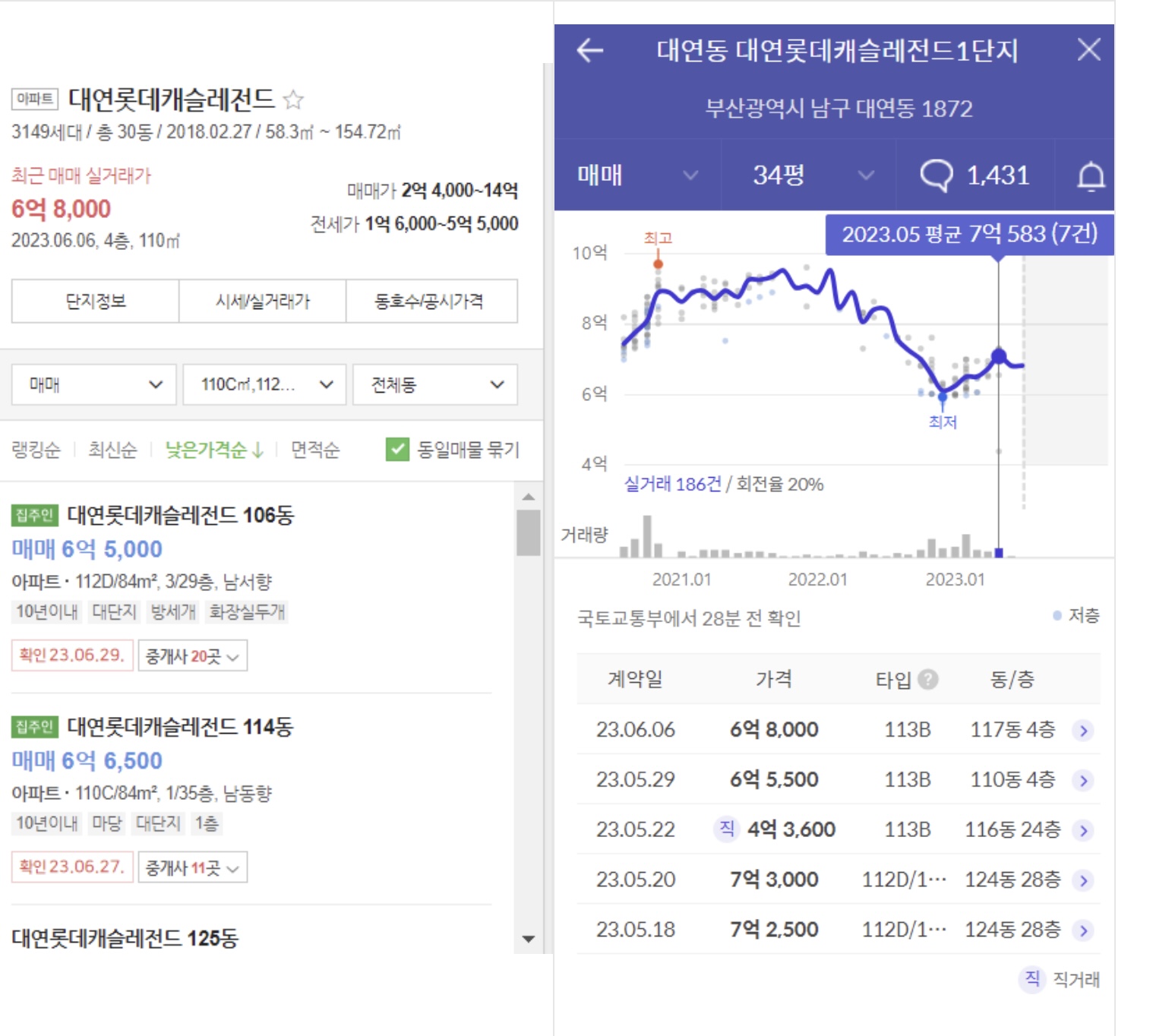 △ 롯데캐슬레전드 84타입의 경우 가장 최근  6억 8000천에 거래되었음을 알 수 있습니다.