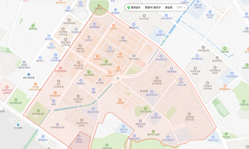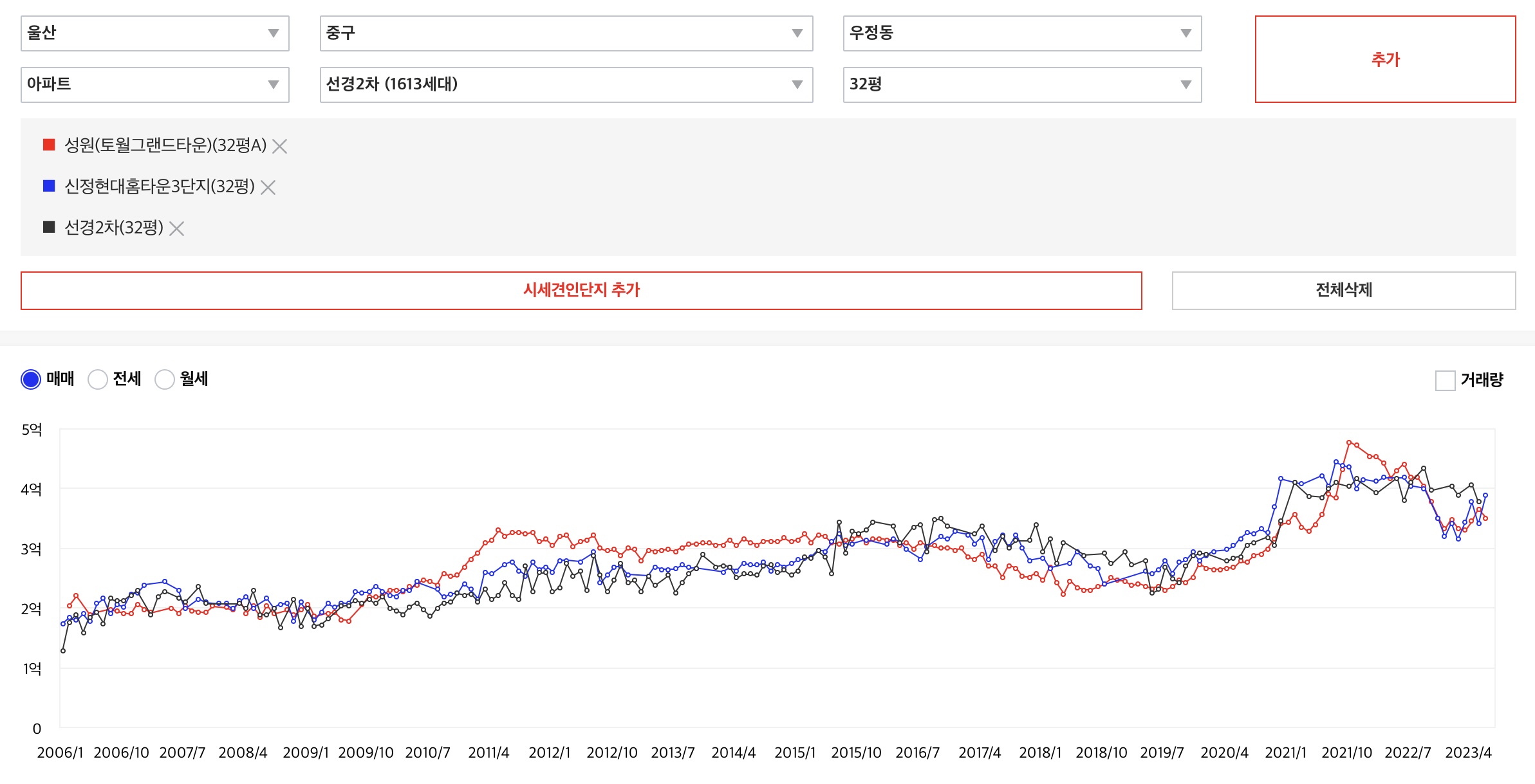 창원시와 비슷한 인구수를 가진 울산광역시 단지와 비교를 해보았는데요. 상급 입지이나 연식이 오래되고 대단지 인 곳 두 곳과 비교해보았어요. 바로 울산 중구 우정동 선경아파트와 울산 남구 신정동 신정현대홈타운 입니다.