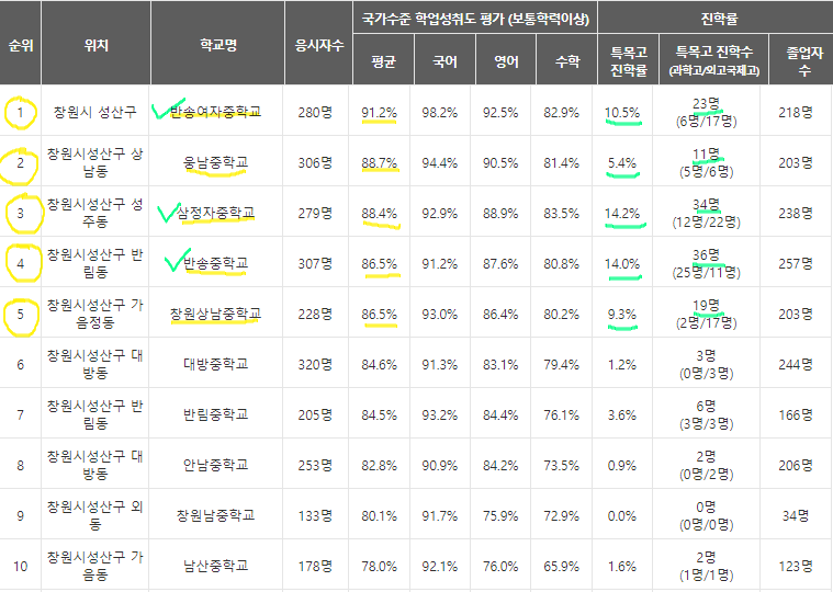 웅남중학교의 경우 창원 내 중학교 학업성취도에서 높은 성적을 자랑하는 학교인만큼 선호도가 높습니다.