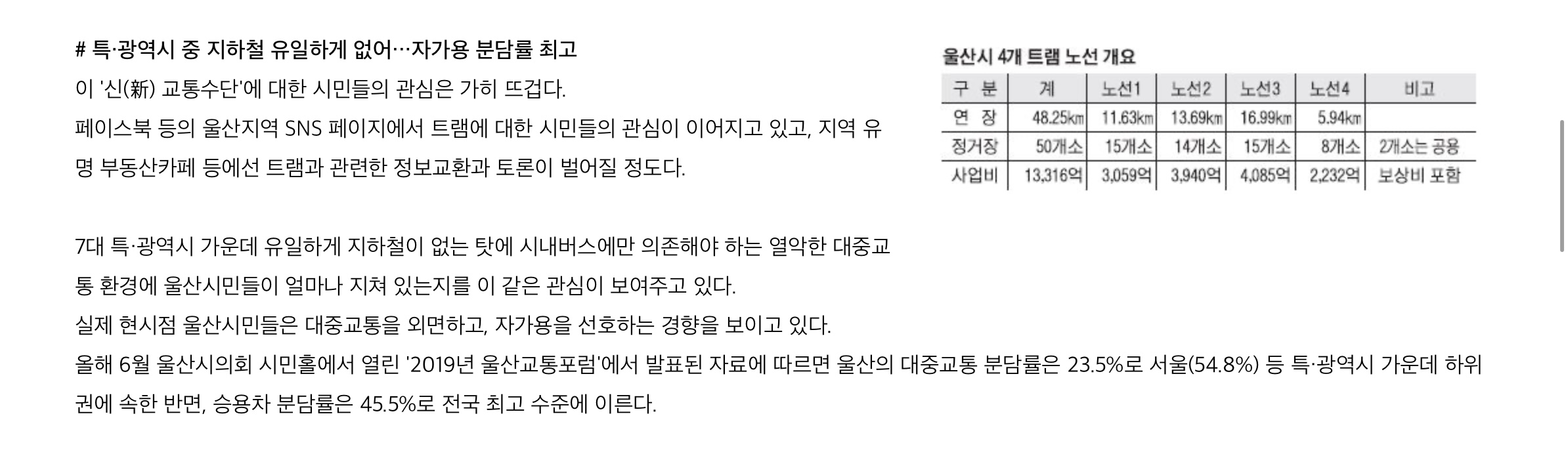울산은 7대 광역시 가운데 유일하게 지하철을 갖추지 못한 도시이다. 시내버스가 유일한 대중교통 수단이라 타 광역시에 비해 대중교통 분담률이 유난히 낮으며, 승용차 분담률이 전국 최고 수준에 이른다.