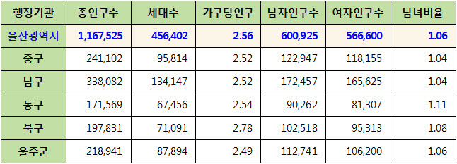 울산 인구수 : 남구 >> 울주군 >북구 > 중구 > 동구